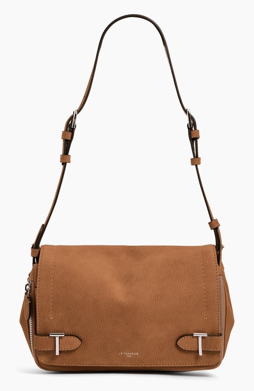 Petit sac bandoulière en cuir nubuck graine avec deux soufflets, doublure jacquard anniversaire, marquage Le Tanneur sur film argent et double T signature.